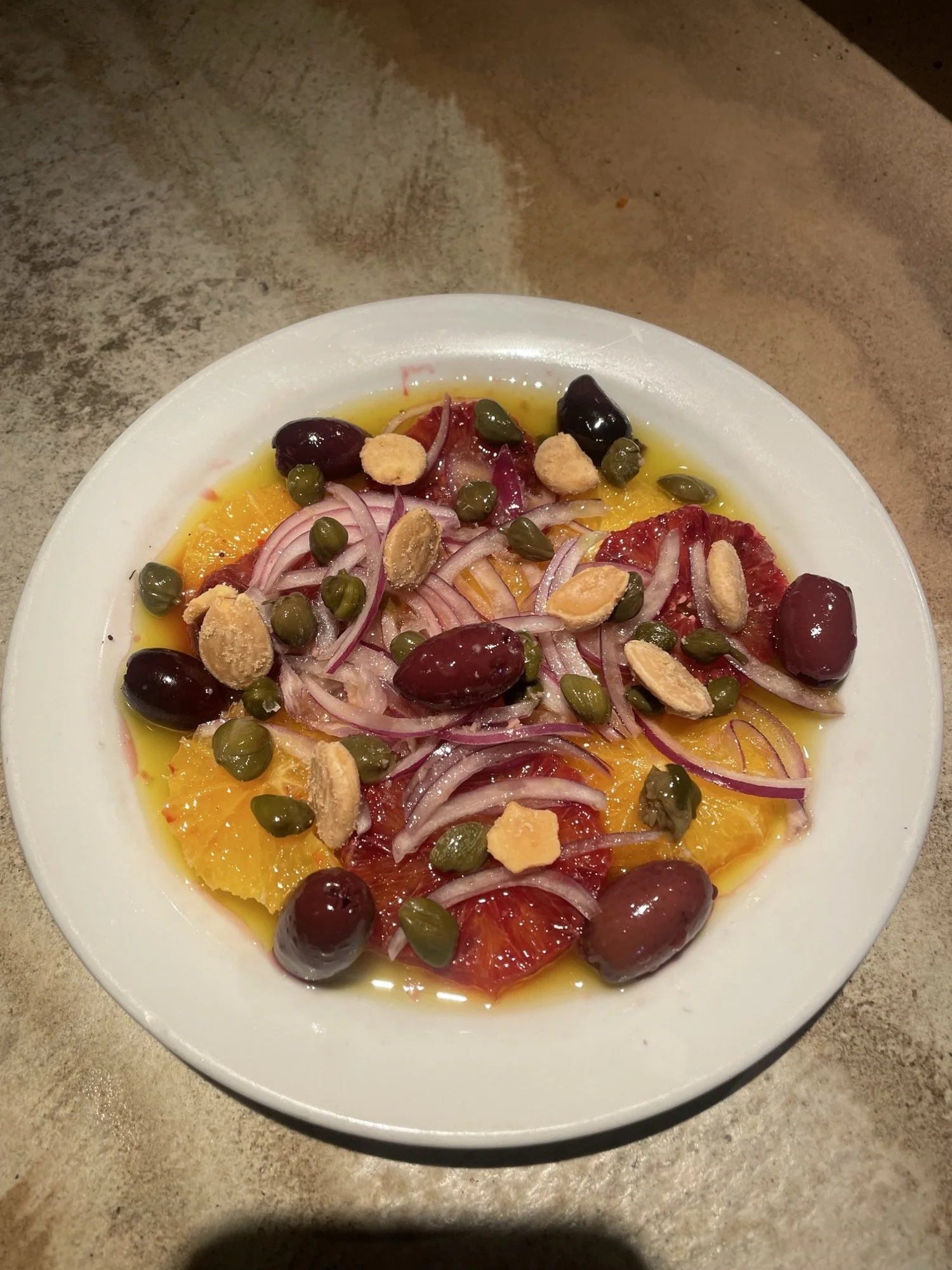 Blood orange, kalamata, almond + caper